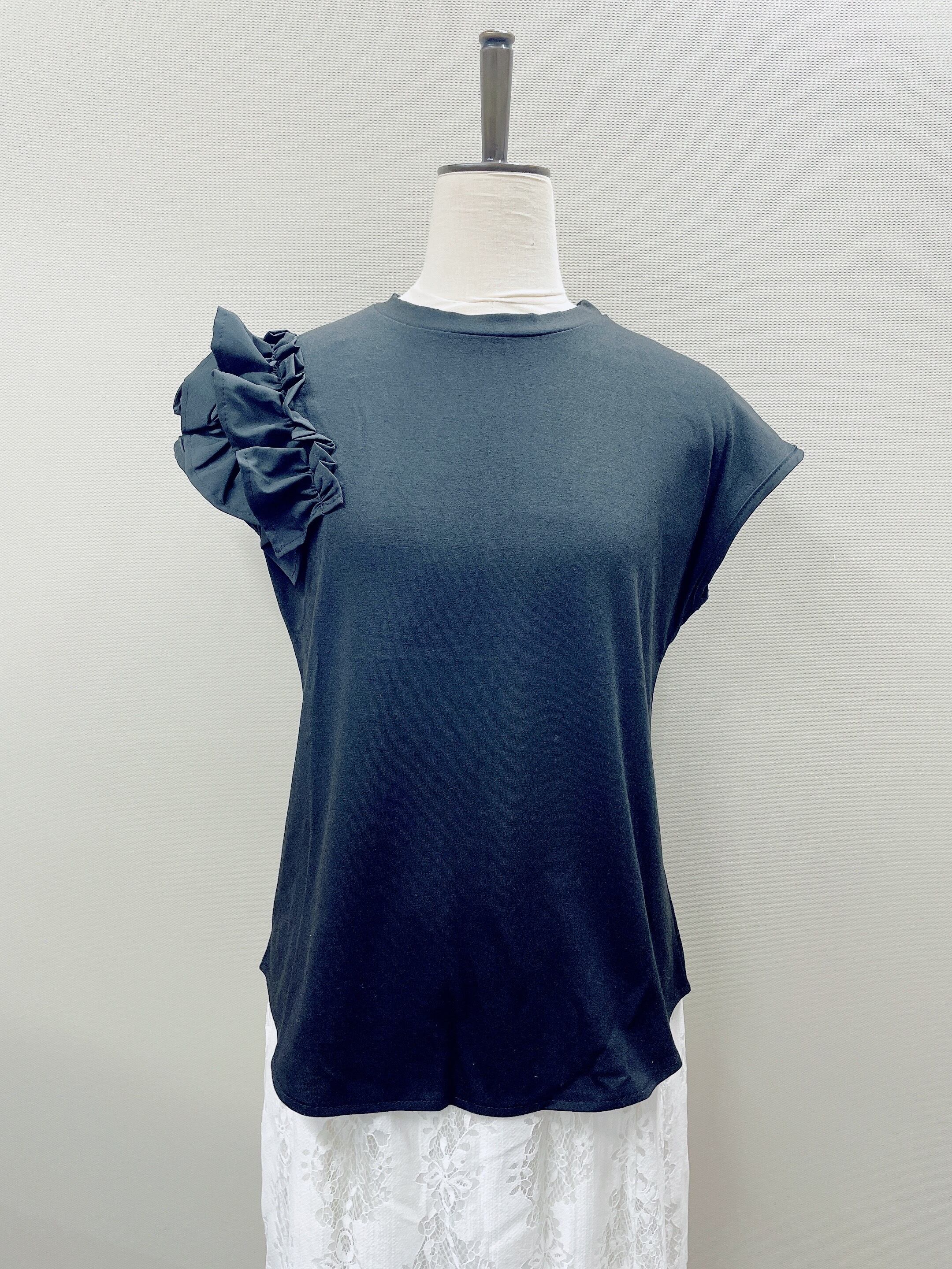 シンプルなシルエットに華やかさを添える、ワンショルダー風のフリルスリーブトップス。左肩にあしらわれた立体感のあるフリルが、女性らしさとエレガントさをプラスしてくれる一枚です。