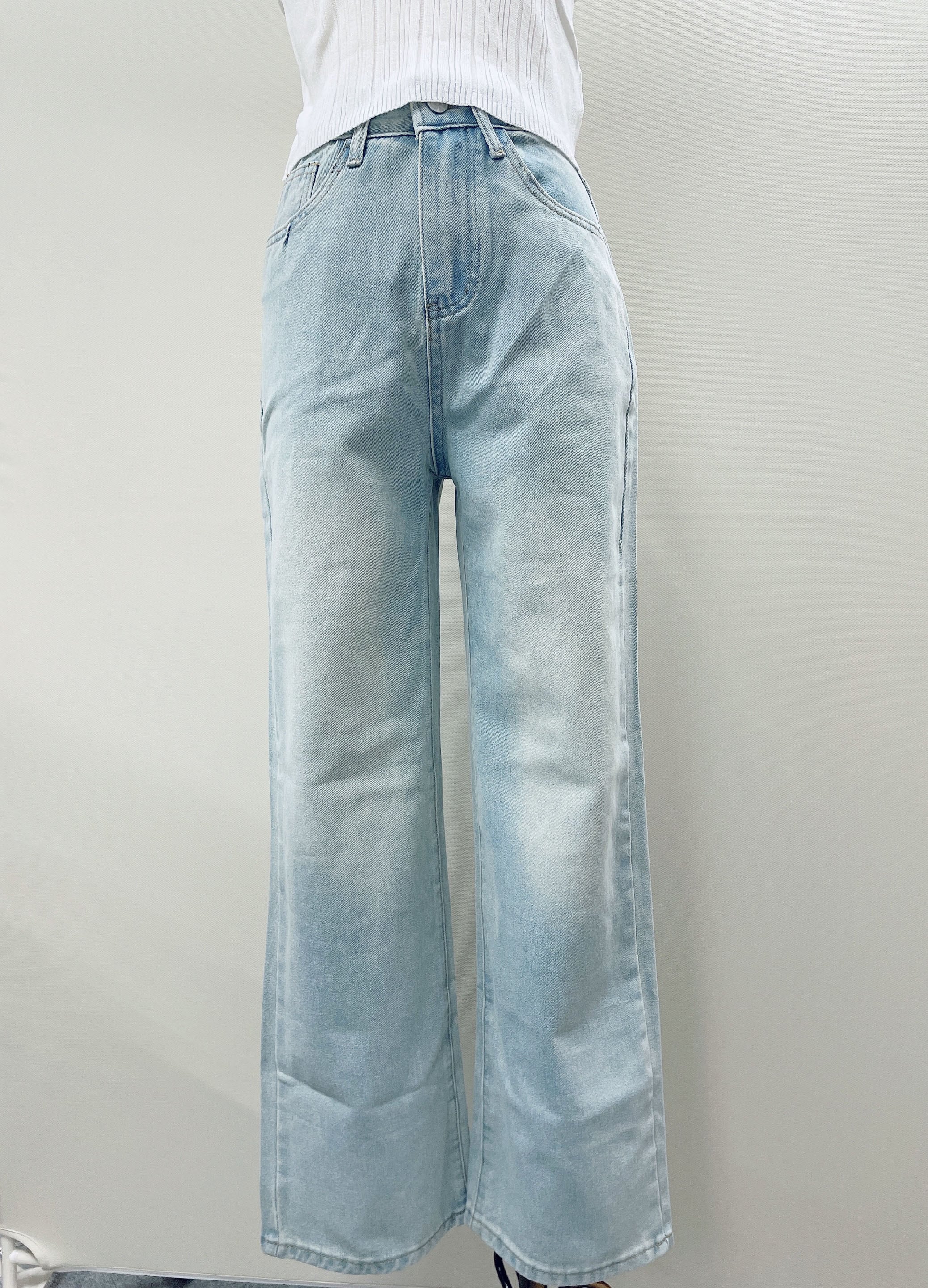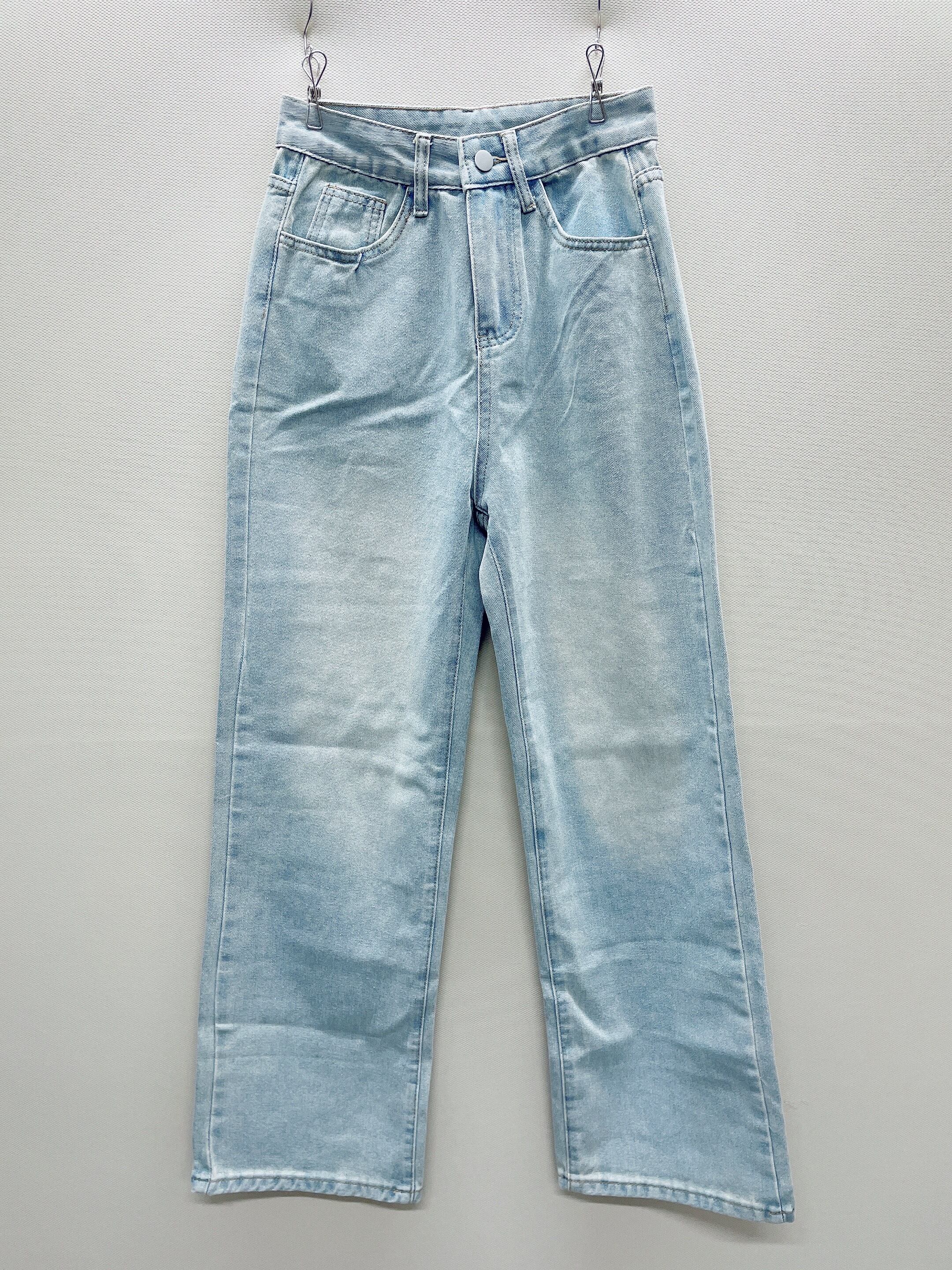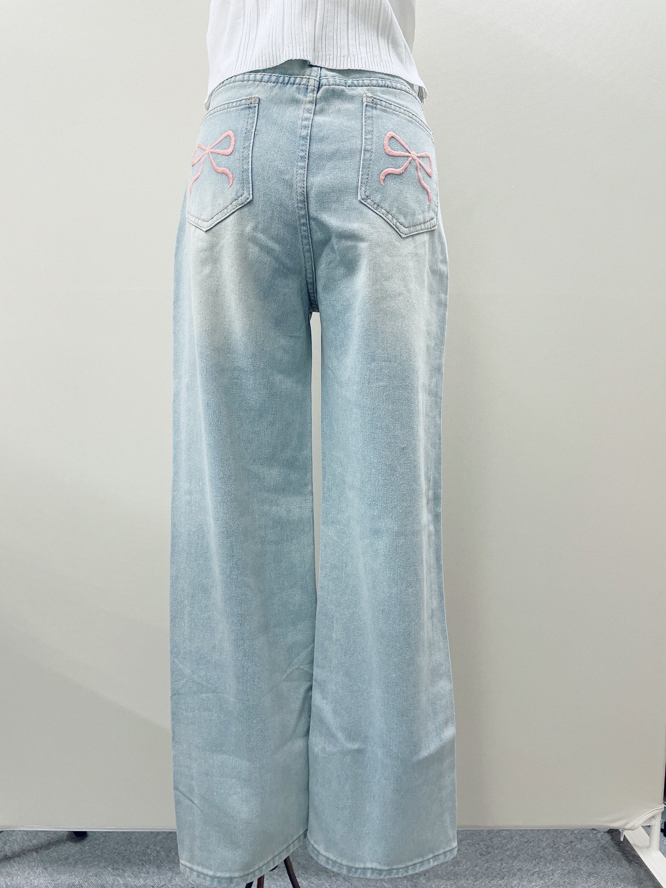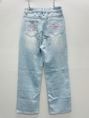 後ろ姿にときめきを仕込んだ、バックポケットのピンクリボン刺繍が目を引くライトブルーデニム。甘すぎないくすみカラーとストレートシルエットで、大人ガーリーにもストリートにもマッチする万能ボトムです。