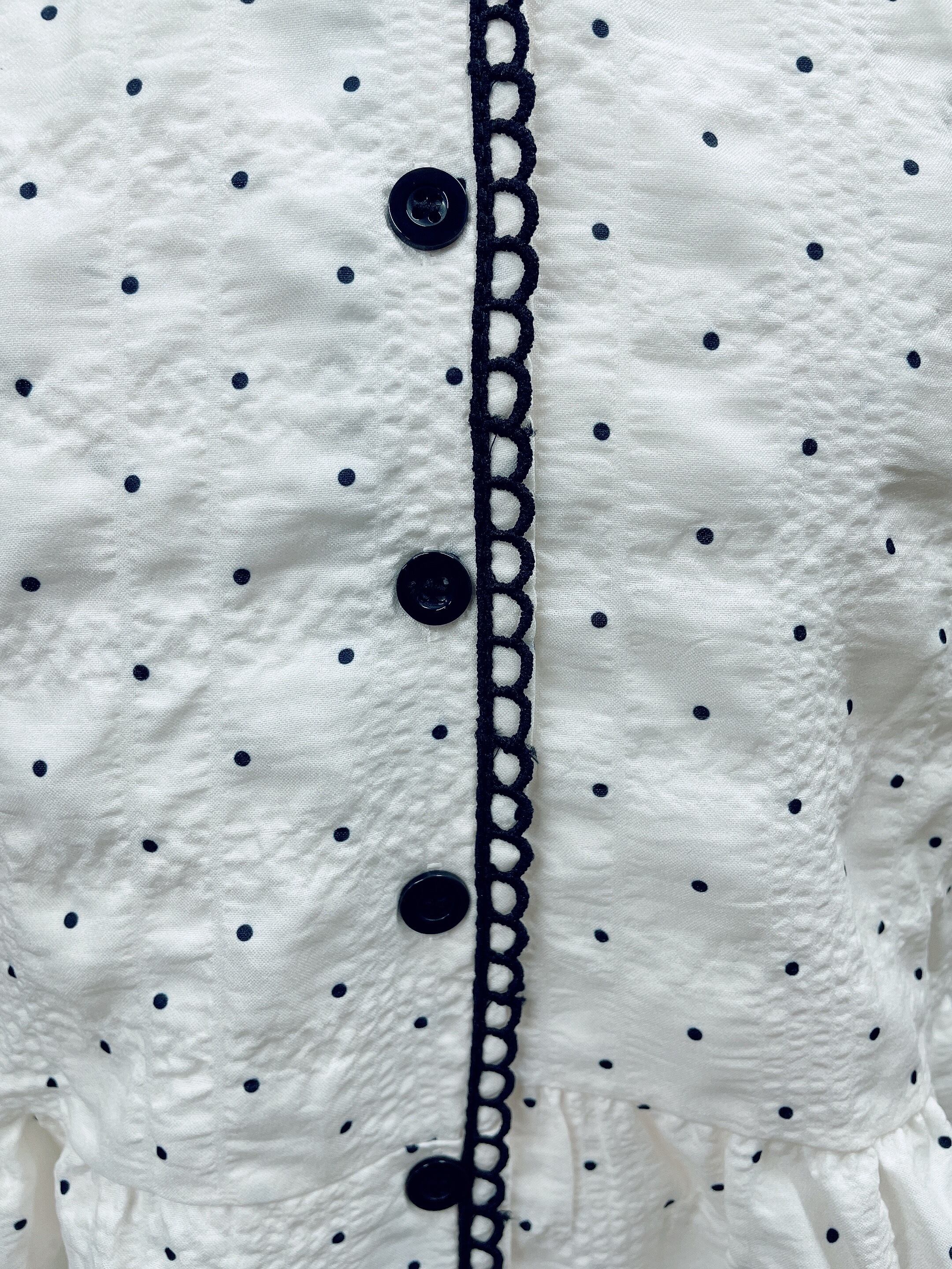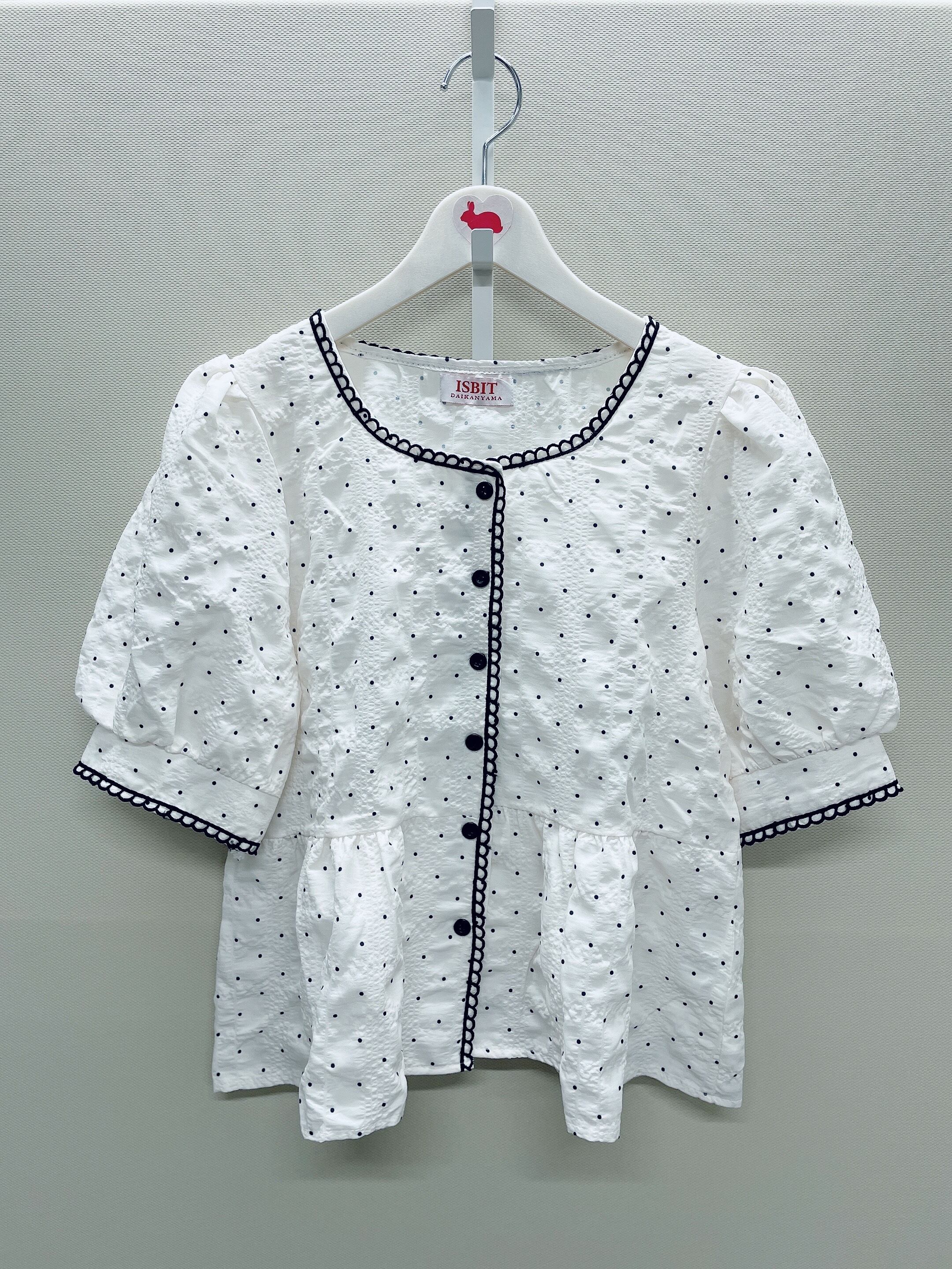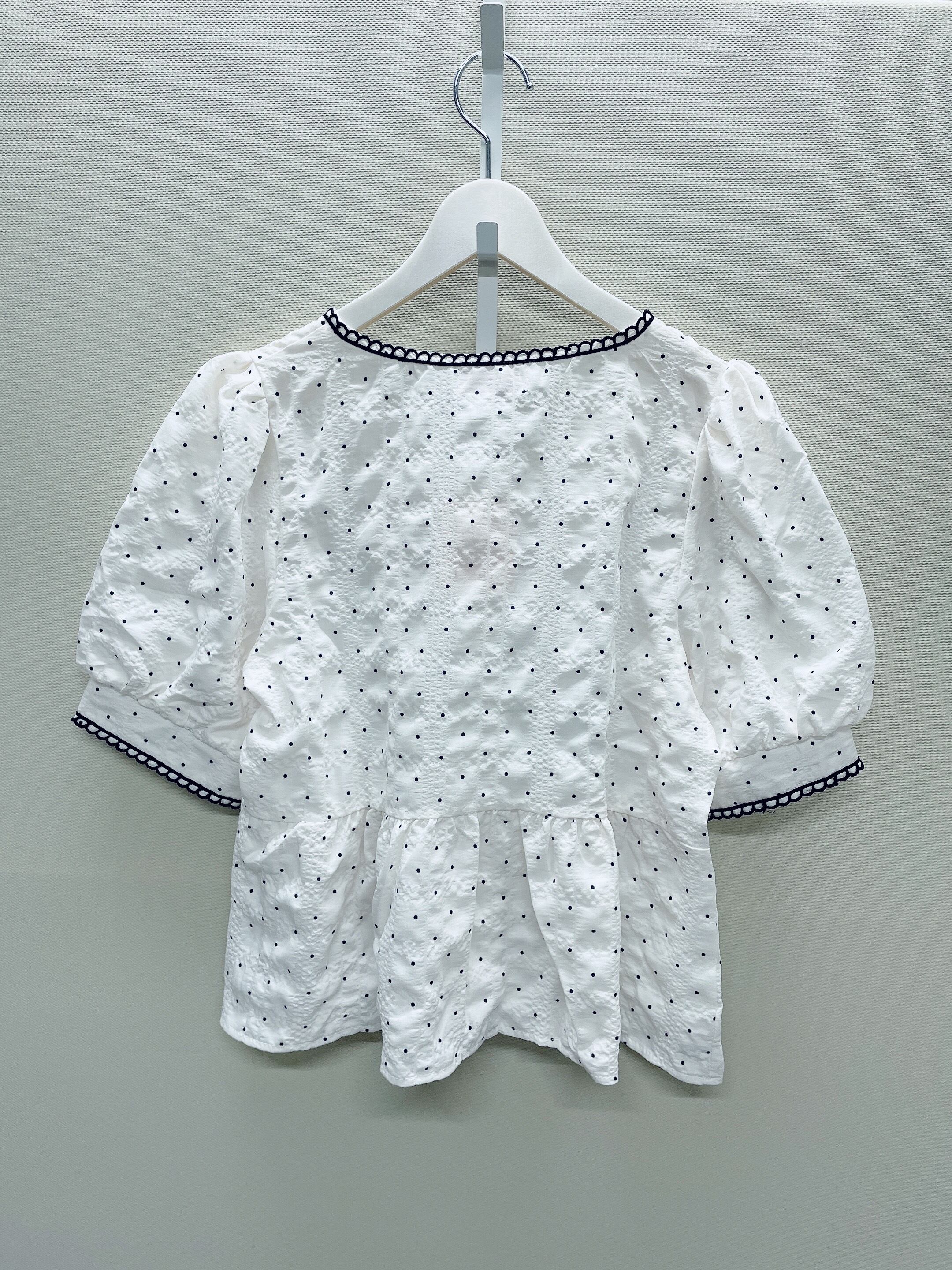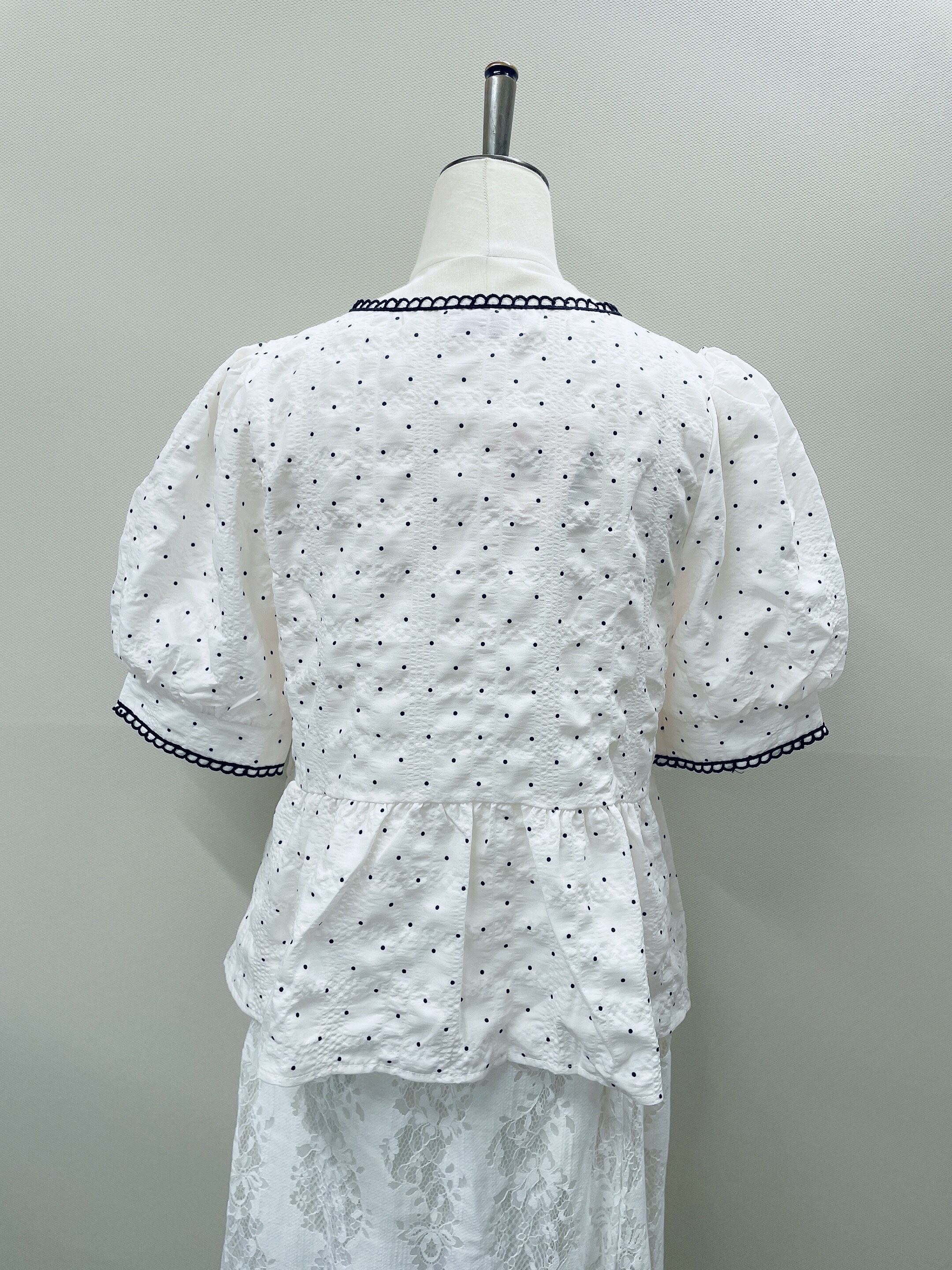 ノスタルジックな雰囲気漂う、小粒ドットの刺繍が印象的なペプラムブラウス。