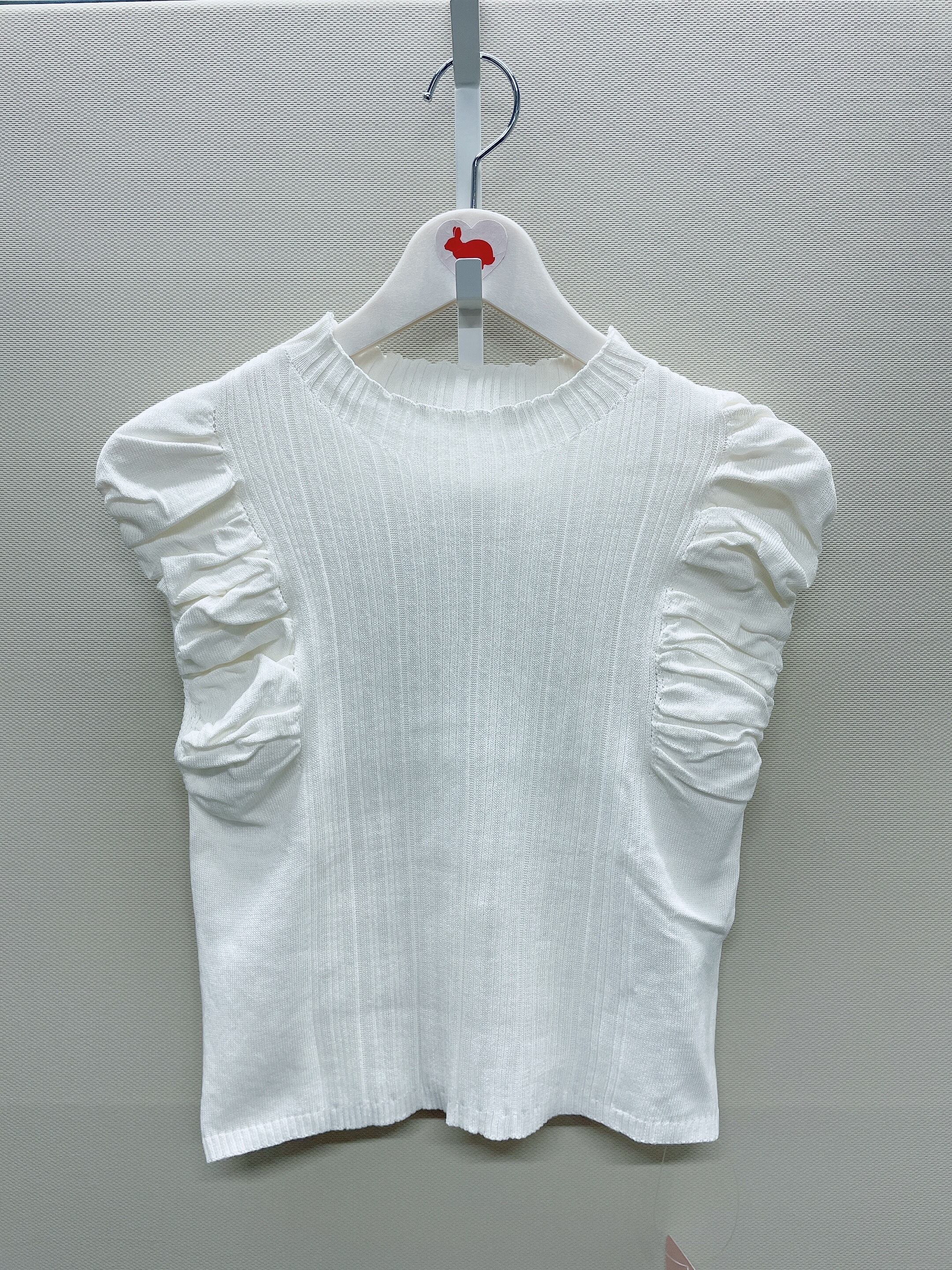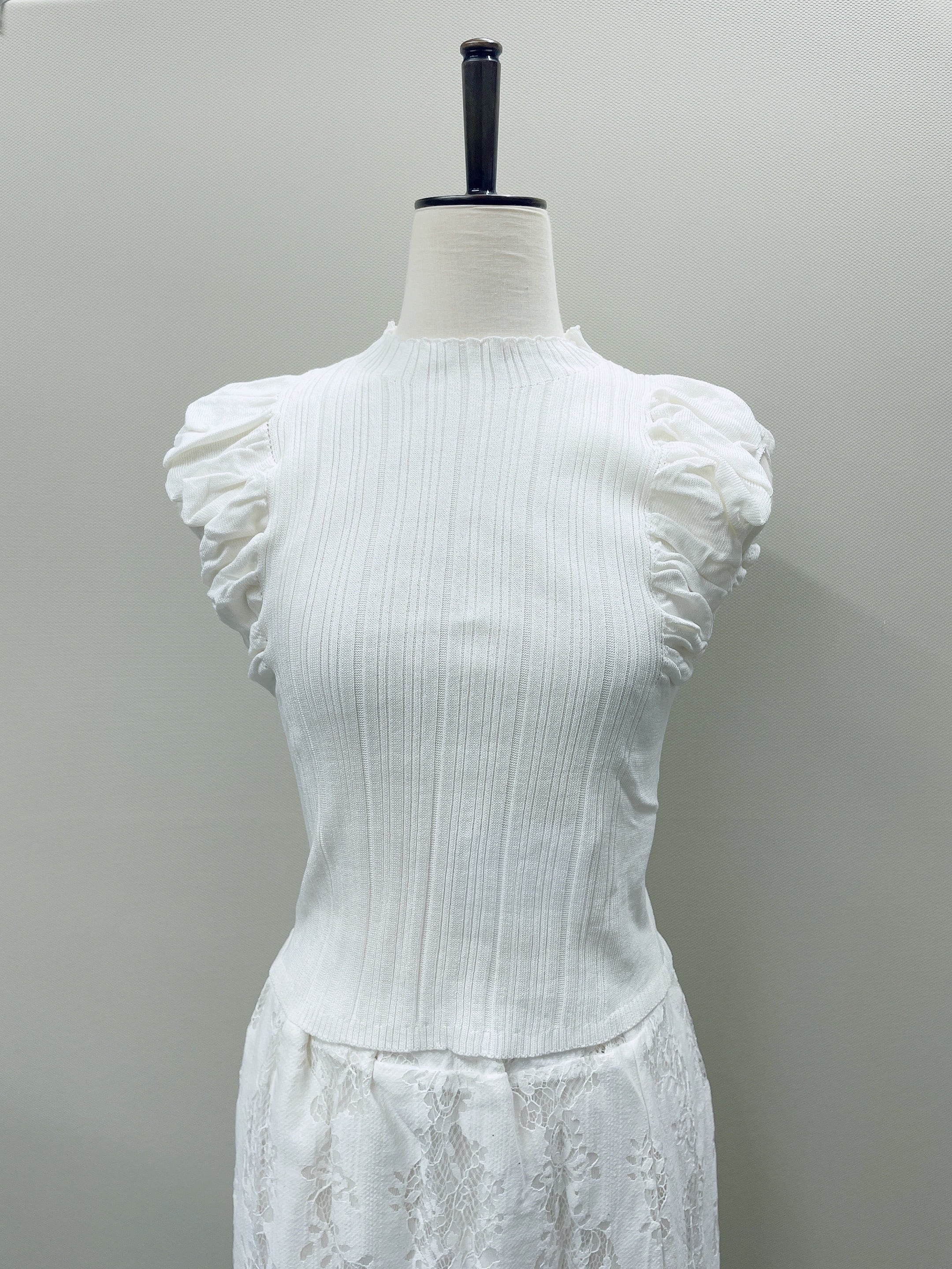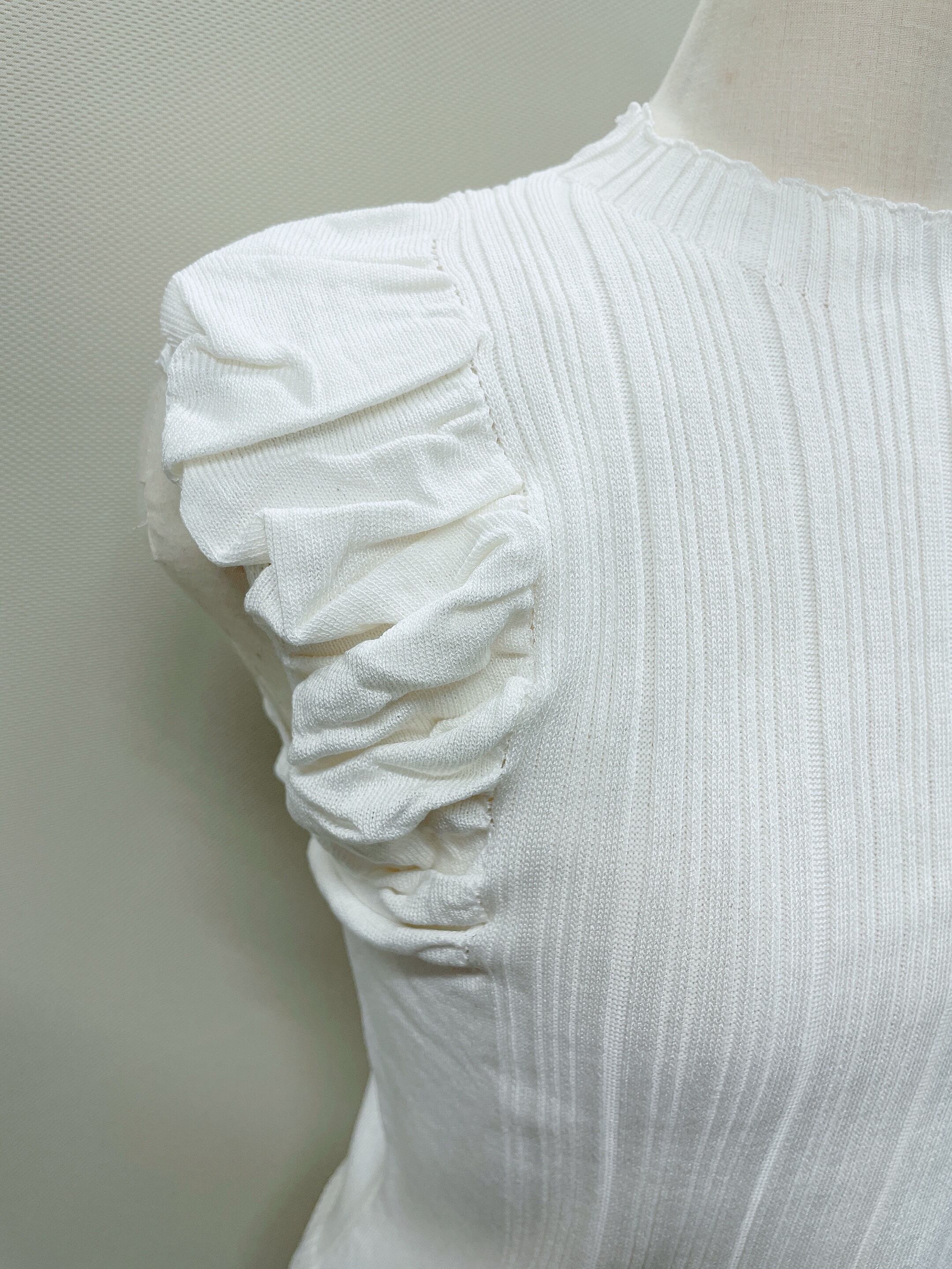 肩に寄せたふんわりフリルが視線を引き寄せる、主役級のリブニットトップス。