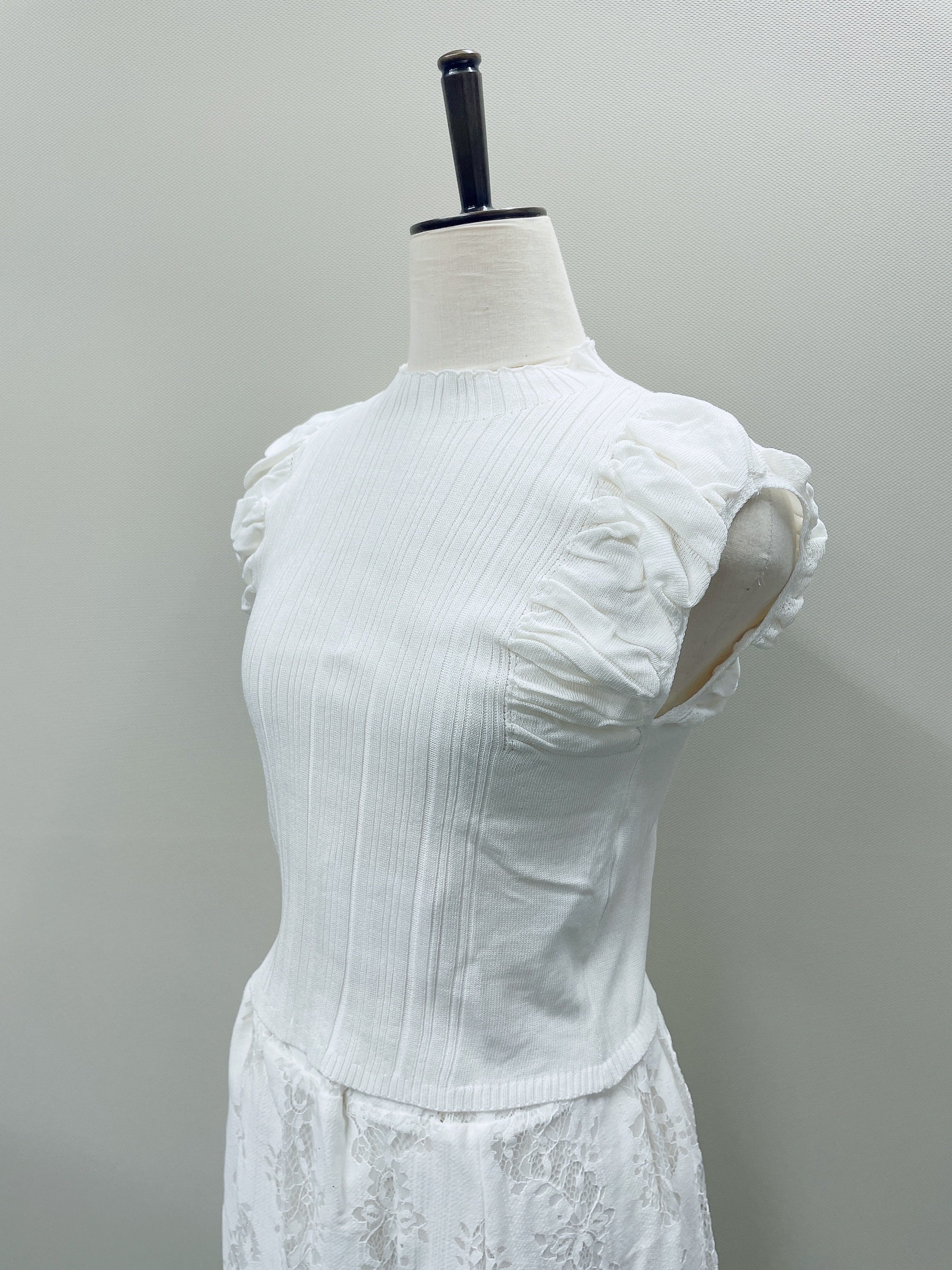 ハイネックぎみの襟元とノースリーブ風の袖まわりが、どこかクラシックな印象を演出。