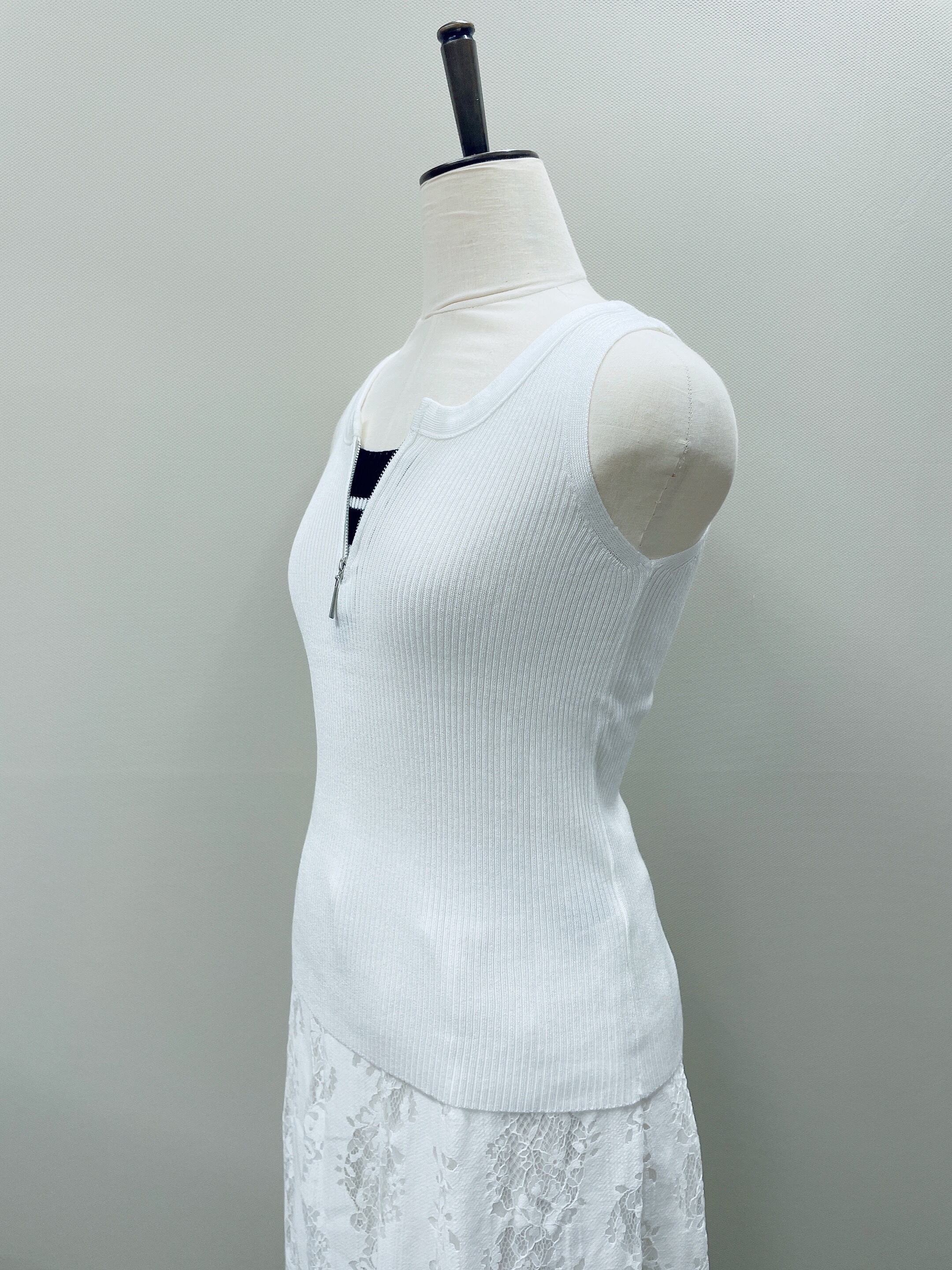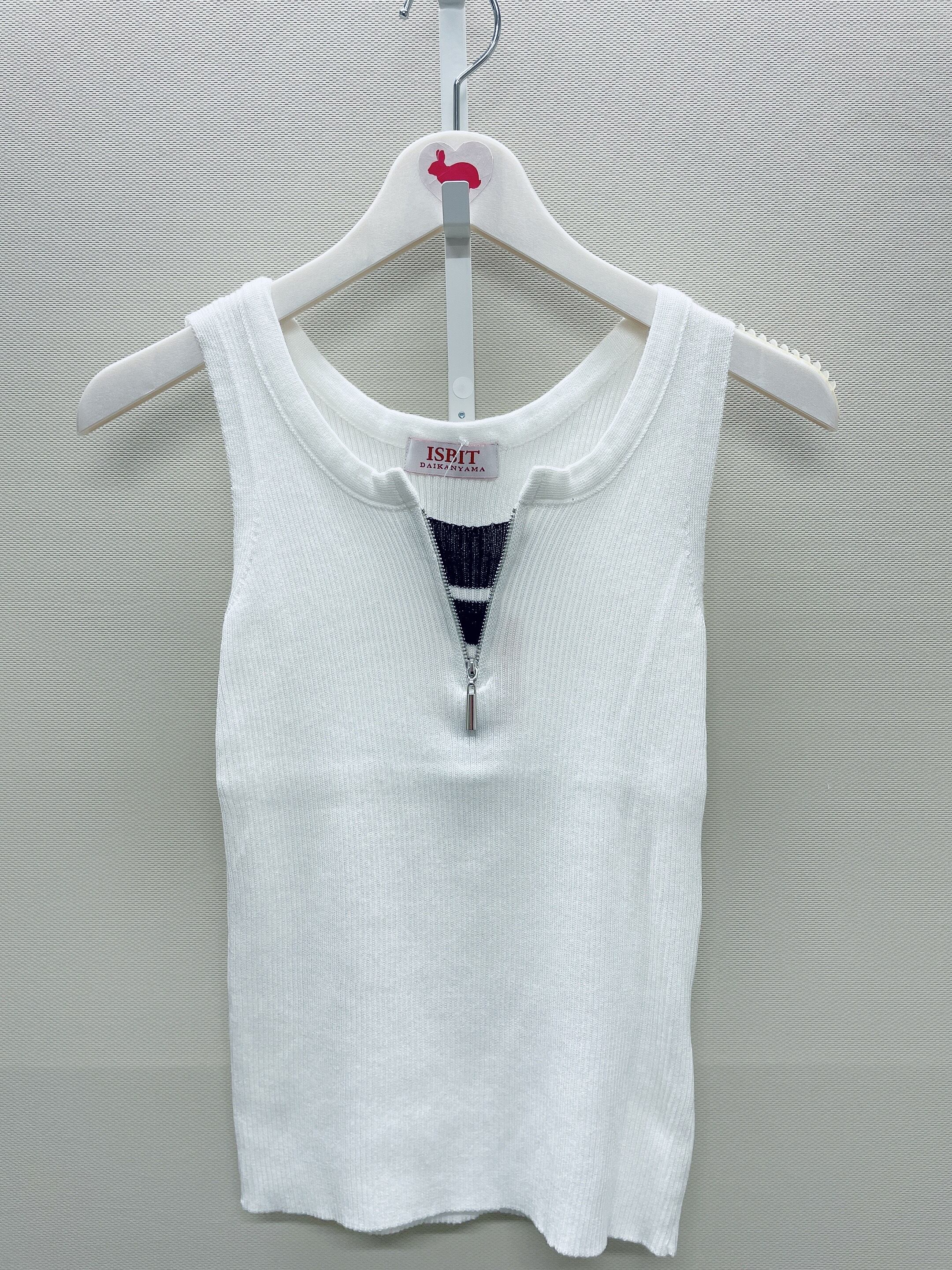 シンプルな中にほどよく個性を効かせた、フロントジップデザインがポイントのノースリーブトップス。