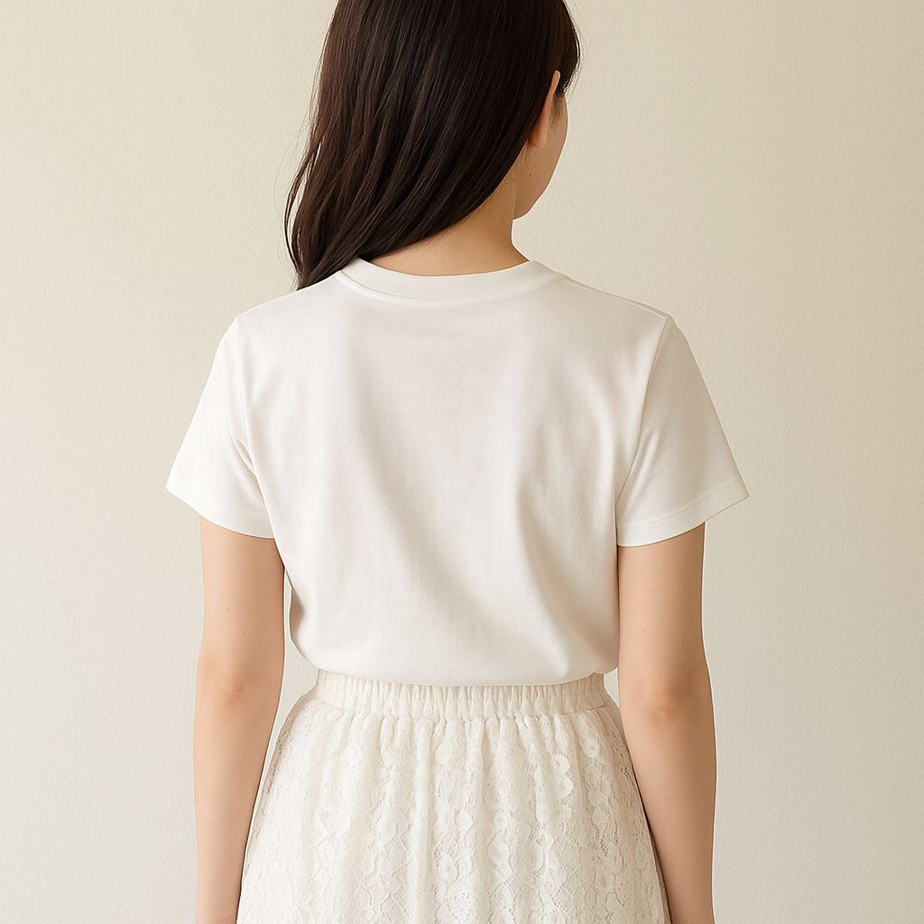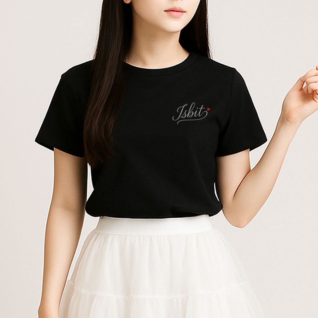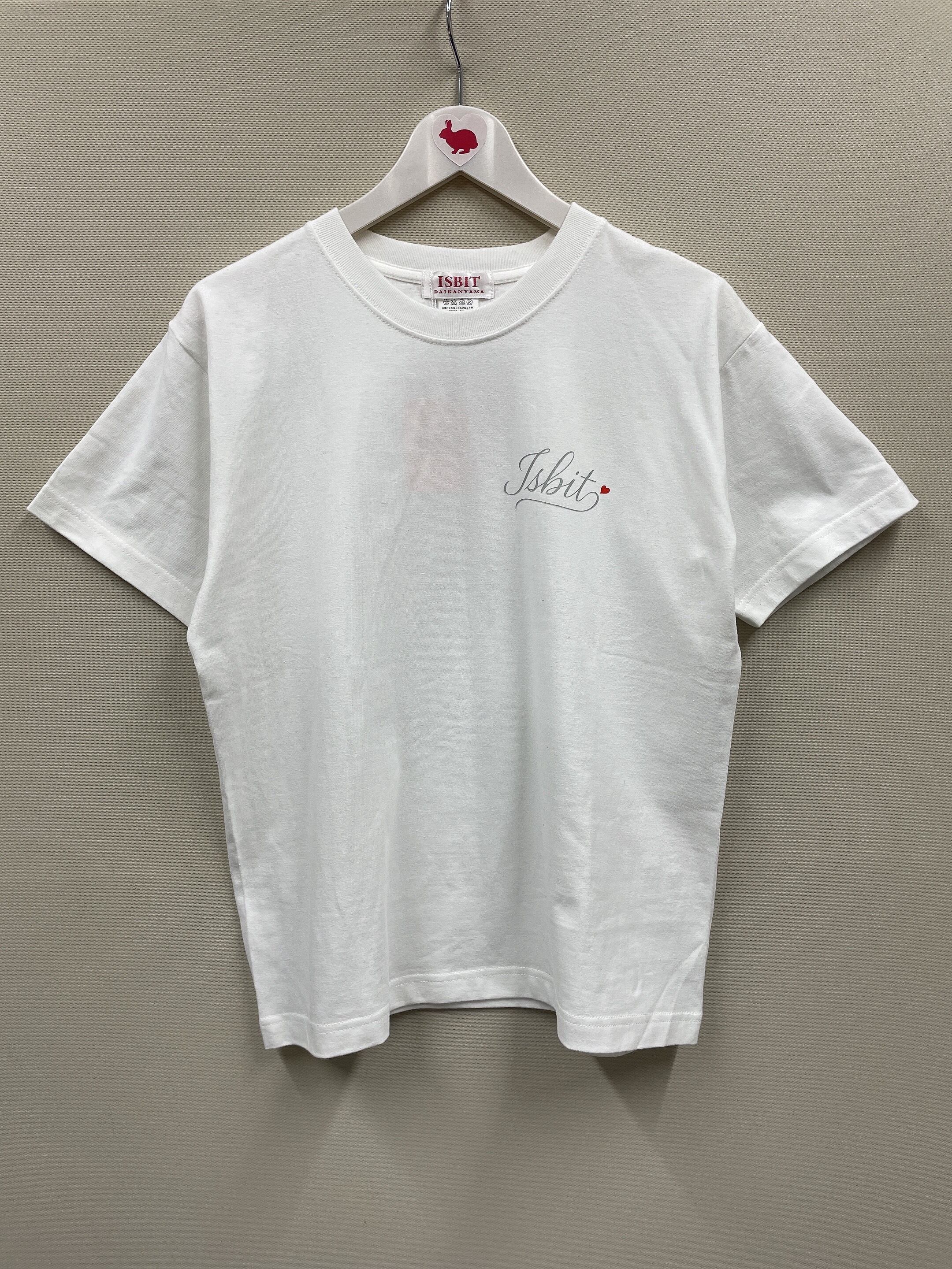 胸元に「Isbit」のロゴを手書き風でプリントし、さりげない小さなハートを添えたシンプルなデザインです。