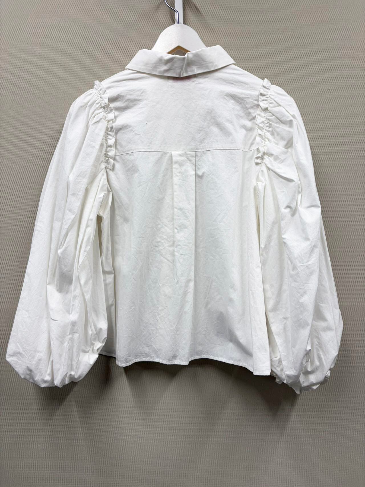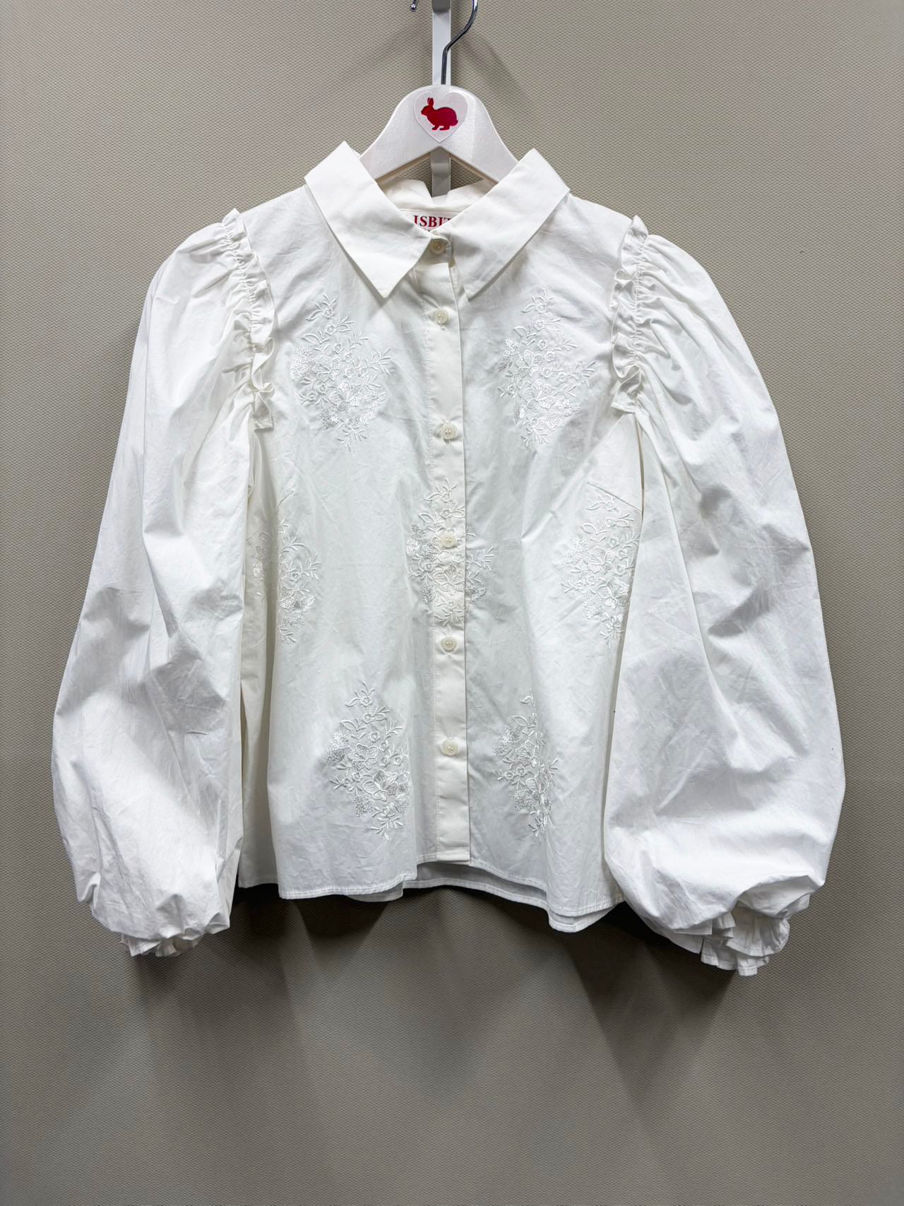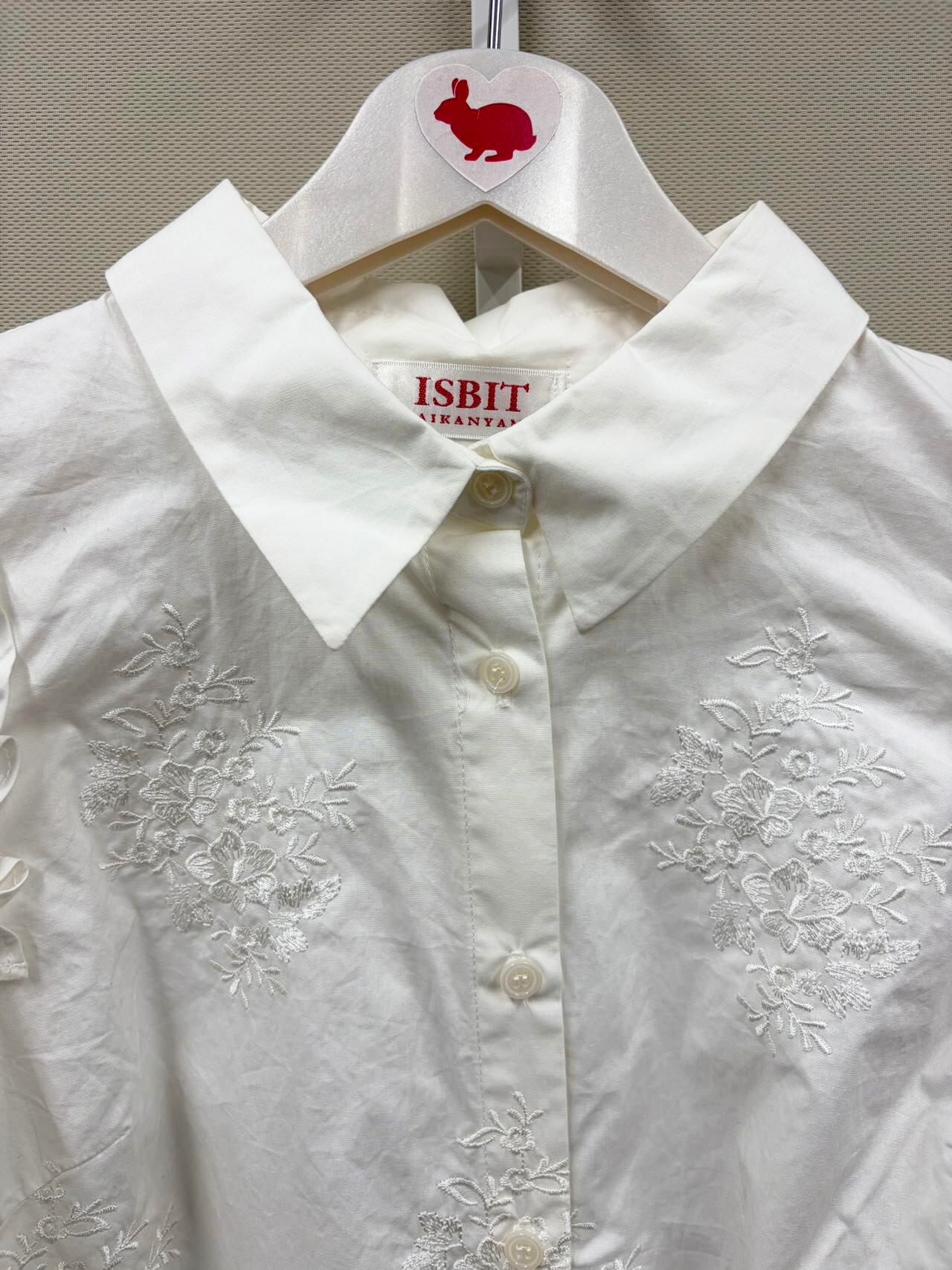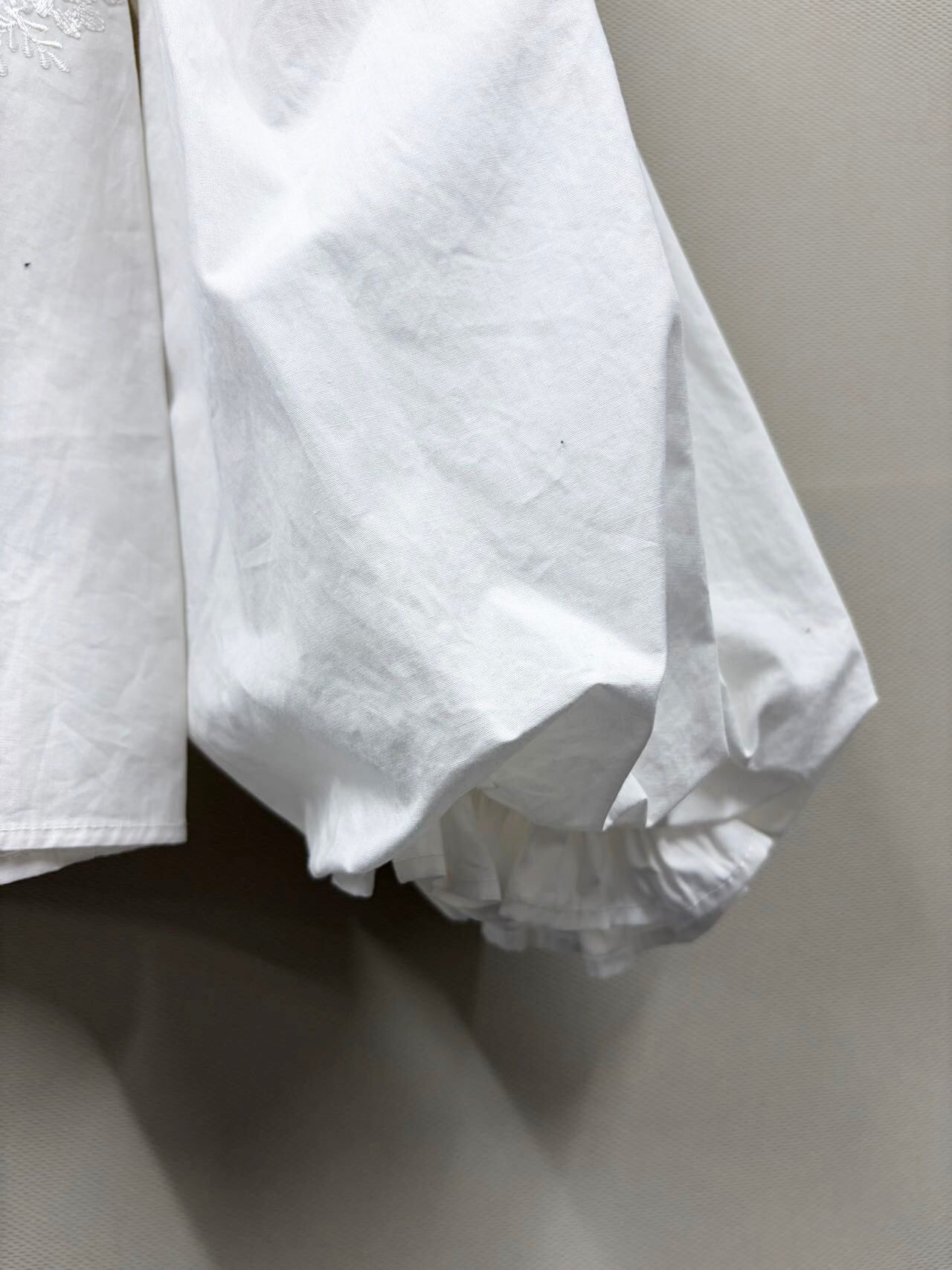 フロントに施された繊細なフラワーレース刺繍が印象的なホワイトブラウス。
